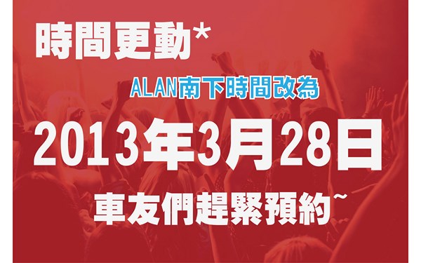 各位車友們,為配合車友時間ALAN南下行程由原本的3/21